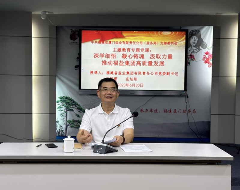 為推動學(xué)習(xí)貫徹習(xí)近平新時代中國特色社會主義思想主題教育走深走實,學(xué)深悟透黨的創(chuàng)新理論,6月30日,福鹽集團黨委副書記、總經(jīng)理莊燦陽到廈門鹽業(yè),以“深學(xué)細悟 凝心鑄魂 汲取力量 推動福鹽集團高質(zhì)量發(fā)展”為題,為廈門鹽業(yè)干部職工講授主題教育專題黨課。