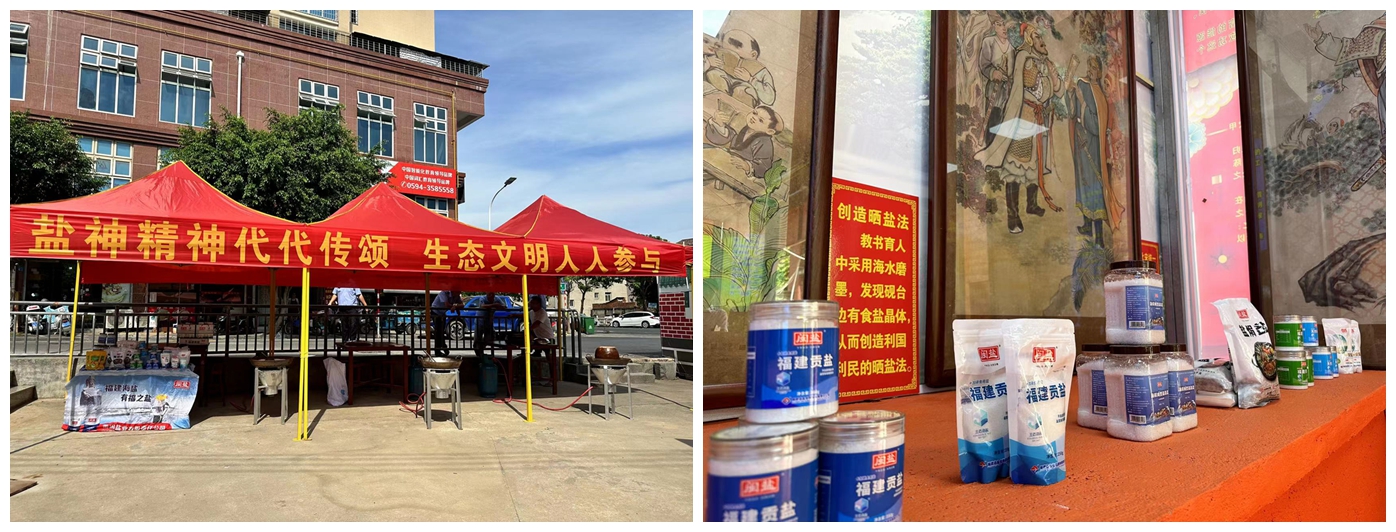 作為莆田海鹽文化的傳承人,莆田鹽業(yè)積極參與,在現場擺設“閩鹽”牌莆田海鹽產品展示臺,向導演組、涵江區(qū)宣傳部門及當地群眾宣傳莆田人民堅持生態(tài)文明的理念,一直堅持沿用“鹽神”陳應功首創(chuàng)的“曬鹽法”制作海鹽產品,如“閩鹽”生態(tài)海鹽系列福建貢鹽、天然海晶鹽以及功能鹽產品海鮮肉類洗滌鹽、漱口鹽、果蔬洗滌鹽等。