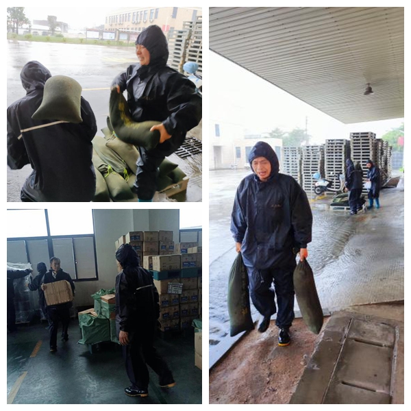 (7月28日臺(tái)風(fēng)“杜蘇芮”登陸后,晶海輕化車(chē)間包裝物倉(cāng)庫(kù)卷閘門(mén)滲水,搶險(xiǎn)黨員突擊隊(duì)隊(duì)員緊急堆疊沙袋堵漏,并轉(zhuǎn)移包裝物。)