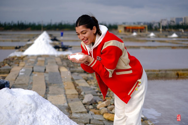 在聽完工作人員的介紹,得知山腰鹽場的海鹽傳統(tǒng)曬制技藝是第七批福建省非物質(zhì)文化遺產(chǎn)項(xiàng)目后,世界旅游小姐們不禁連連稱贊,好奇心頓增,手持鹽耙跟著鹽工師傅學(xué)習(xí)制鹽技術(shù),沉浸式體驗(yàn)海鹽文化魅力,并自發(fā)化身為福鹽集團(tuán)產(chǎn)品“推介官”,宣傳推廣“閩鹽”、“福鹽”等高端生態(tài)海鹽產(chǎn)品。