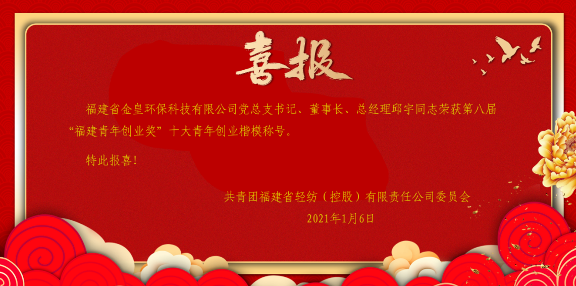 日前,共青團(tuán)福建省委公布第八屆“福建青年創(chuàng)業(yè)獎(jiǎng)”表彰對(duì)象名單。經(jīng)主辦單位和專家?guī)煸u(píng)委聯(lián)合評(píng)審,并經(jīng)團(tuán)省委書記會(huì)研究確定,共有50名同志獲得相關(guān)獎(jiǎng)項(xiàng)表彰。其中,福建輕紡權(quán)屬福建省金皇環(huán)??萍加邢薰军h總支書記、董事長(zhǎng)、總經(jīng)理邱宇同志榮獲“十大青年創(chuàng)業(yè)楷模”稱號(hào)。